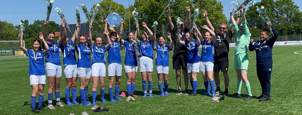 De altijd sterk spelende Isa had zelf ook wel een doelpunt verdiend en zocht naar een schietkans wat uiteindelijk ook zou lukken: ze schoot via de keeper de 6-0 eindstand binnen. Nadat de scheidsrechter voor de laatste maal floot vlogen de meiden in elkaars armen: KAMPIOENEN!!! Alle meiden en de coaches kregen een medaille en een witte roos met blauw/witte linten; de kampioensschaal werd uitgereikt aan aanvoerder Nikki die met het gehele team gehuldigd werd door de vele toeschouwers en het feest barstte los! Ze kregen nog een fles vreugdebubbels om de lucht in te spuiten echter moesten de coaches het ontgelden en werden met een brede lach kletsnat gespoten.