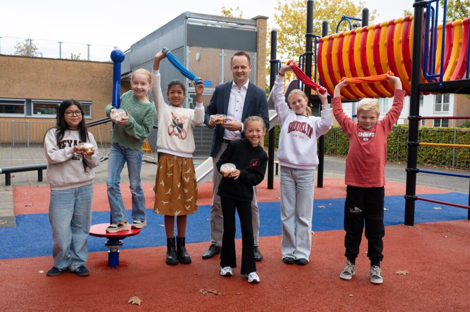 Wethouder Bart Kabout deelde aan een deel van de 22 leraren van basisschool De Brug een fruitbakje uit. De leraren konden de gezonde traktatie erg waarderen.