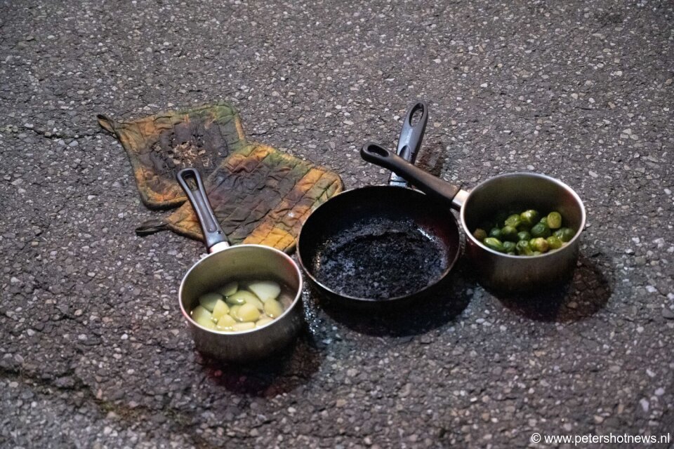 Op het fornuis troffen zij inderdaad een verbrandde pan aan met pannenlappen.