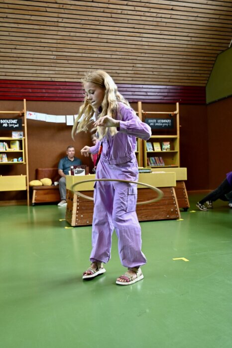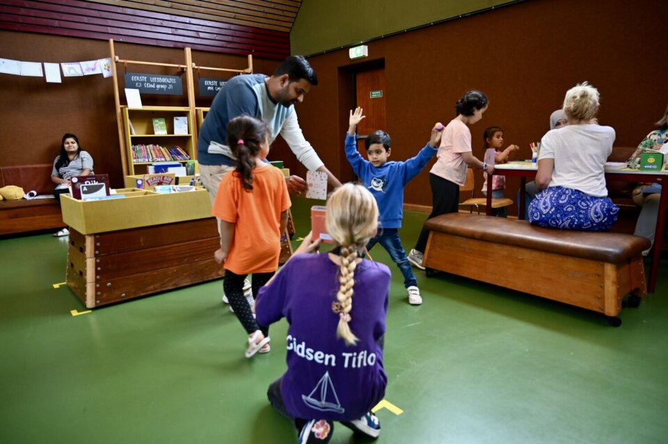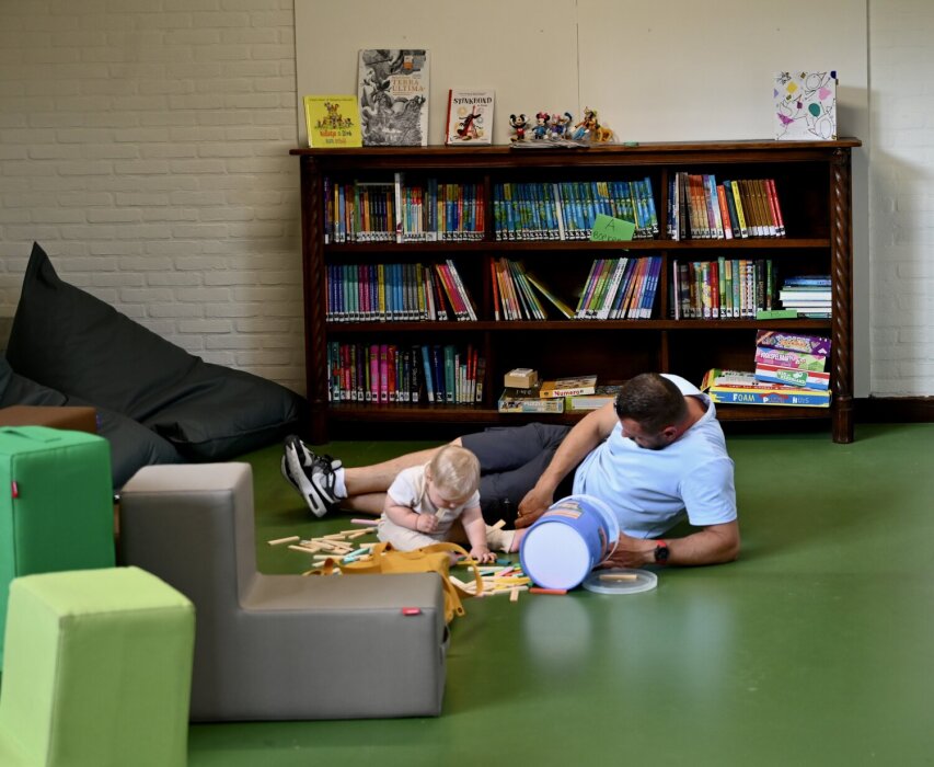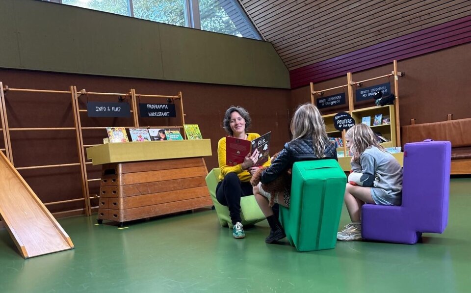 De kleine gymzaal nodigt meteen uit tot bewegen. Van de turnkasten zijn boekenbakken gemaakt en aan de rekken hangen vakken met boeken. En er is een glijbaan. “Kinderen mogen hier met stoelen slepen, van de glijbaan afglijden, spelletjes spelen en rennen. Ze pakken er een boek bij, lezen een stukje en gaan dan weer spelen. Zo worden de kinderen enthousiast en gaan er ook boekjes mee naar huis. Ze vinden het een fijne plek. En zo ontstaat vaak ook leesplezier.”