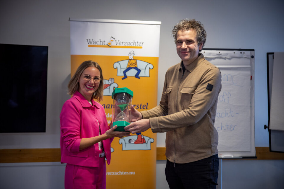 Tijdens een startbijeenkomst voor welzijnswerkers, Wmo-consulenten en samenwerkingspartners kreeg wethouder Cees van Uden een grote zandloper overhandigd. Deze zandloper staat symbool voor de lange wachttijden in de geestelijke gezondheidszorg. Lotte Willemsen (coördinator in De Ronde Venen) en Esther van der Meer (regiomanager) van de WachtVerzachter vertelden over het project. Met de WachtVerzachter kunnen inwoners vanaf 17 jaar en ouder tijdens de wachttijd al werken aan herstel.