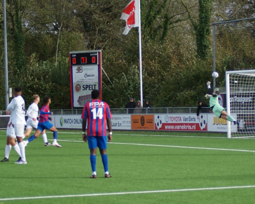minuut een overtreding wordt gemaakt op zo’n 25 meter van de goal, plaatst de linksbenige back zichzelf achter de bal. Zijn trap is weergaloos, een tien met een griffel. De geplaatste bal heeft een lichte curve en exact de juiste snelheid om onhoudbaar voor keeper Kris van Rijn in de rechter bovenhoek te verdwijnen. Een beauty van een goal die leidt tot een vreugdexplosie bij het thuispubliek. Zal het dan toch? Na de goal gaat het nog even gelijk op, Mick van de Loo en Erkelly de Sa stuitten beide een keer op de Argon goalie. En aan de andere zijde kruipt CSW een keer door het spreekwoordelijke oog van de naald. De paal brengt redding op een schot van Zinga. Terugkijkend op de mindere start in vorig seizoen voor het 16-tal van coach Jeffrey Vlug, dan hadden we dergelijk gelukje niet gehad. Toen vielen al dit soort momenten in het nadeel van zijn team. Ik noem bewust 16-tal, want als er iets opvalt wanneer ik met mijn camera een plaatje schiet van de dug-out dan is het de uitstraling van saamhorigheid. En natuurlijk het is mij bekend, als je wint heb en ben je vrienden. Maar het heeft er op dit moment de schijn van dat alle spelers, ook bij een teleurstelling van niet mogen starten, bijdragen aan het teambelang. En dat is geweldig om te zien. En wat mij betreft een pluim op de hoed van de stafleden(!)