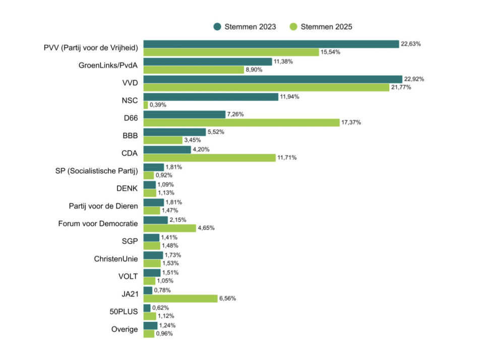 Volgens de voorlopige verkiezingsuitslag heeft de VVD in De Ronde Venen de meeste stemmen gekregen tijdens de verkiezingen voor de Tweede Kamer. In totaal hebben 29.485 stemgerechtigde inwoners van De Ronde Venen hun stem uitgebracht. Dat is een opkomstpercentage van 84,04 procent. Dat percentage is hoger dan tijdens de vorige verkiezingen voor de Tweede Kamer, in 2023. Toen bracht 83,09 procent van de kiesgerechtigden zijn stem uit. In totaal konden 35.270 inwoners hun stem uitbrengen.