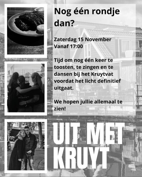 Vanaf 17:00 uur is iedereen welkom om bij het Kruytvat langs te komen voor een laatste avond vol herinneringen, een drankje en misschien een dansje. “We willen graag op een fijne manier afscheid nemen van de plek waar we zoveel mooie momenten hebben beleefd,” laat Team Kruyt weten.