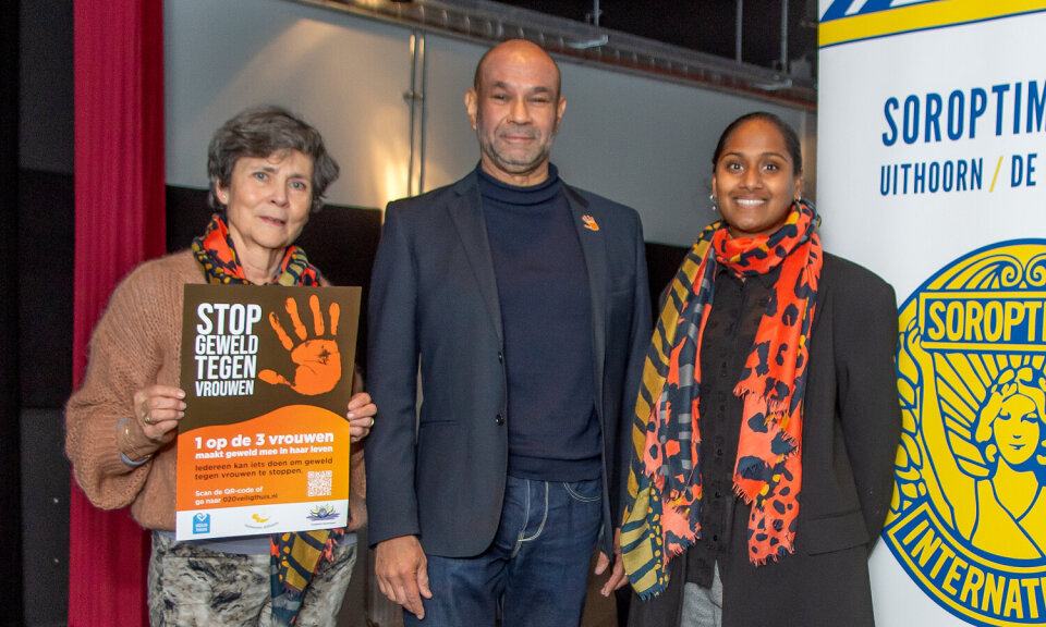 Het gemeentehuis in Mijdrecht staat in een oranje licht, net als verschillende plekken in Uithoorn. Wethouder Anja Vijselaar van de gemeente De Ronde Venen: “Trots ben ik dat ons gemeentehuis oranje kleurt. Gezamenlijk met alle vrouwelijke raadsleden hebben we het gemeentehuis aangelicht. We geven het goede voorbeeld en vragen aan ondernemers met hun panden hetzelfde te doen. We willen het gesprek op gang brengen en het zwijgen doorbreken. Dat doen we niet alleen, maar samen met buurgemeente Uithoorn, met de soroptimisten, onze maatschappelijke partners en de inwoners. Want samen kunnen wij het geweld tegen vrouwen en meisjes stoppen.”