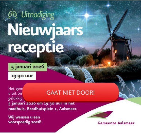 De Nieuwjaarsreceptie van de gemeente Aalsmeer op maandag 5 januari gaat helaas niet door.