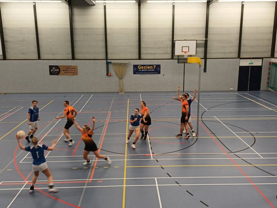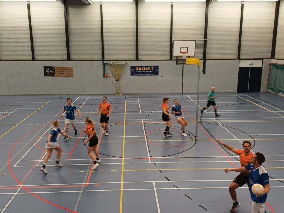 Onrustig spel Nadat beide teams en het jeugdteam van de week, de J5, door sporthalspeaker Marieke Claassen op heldere wijze waren voorgesteld floot arbiter Wijkstra voor het begin van de wedstrijd. Het zou zeker niet zijn laatste fluitsignaal zijn. Al binnen drie seconden was Eva Hemelaar voor de thuisploeg trefzeker: 1-0. Direct daarna kreeg KIOS een strafworp en nog geen vijf minuten later was het 4-4. (Vinkendoelpunten van Jerom Stokhof, Matthijs de Rooij en Levi Kroon)