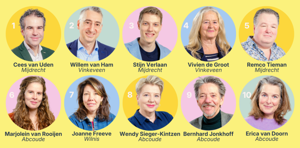 Compleet team De lijst laat verder een sterke vertegenwoordiging zien uit de diverse kernen, met Joanne Freeve uit Wilnis (7) en een stevig blok uit Abcoude met Wendy Sieger-Kintzen (8), Bernhard Jonkhoff (9) en Erica van Doorn (10).