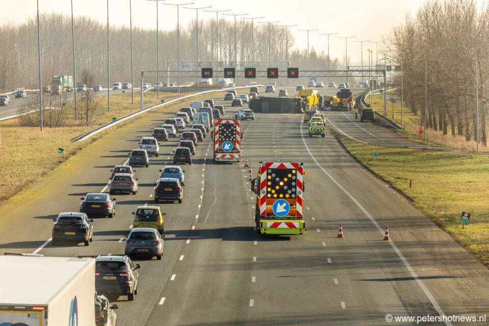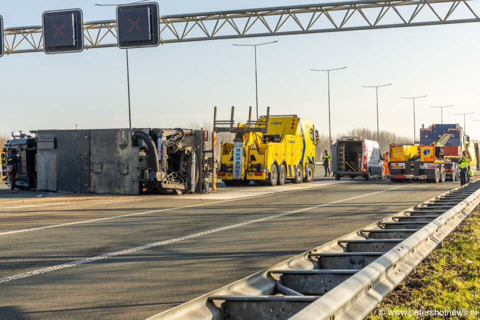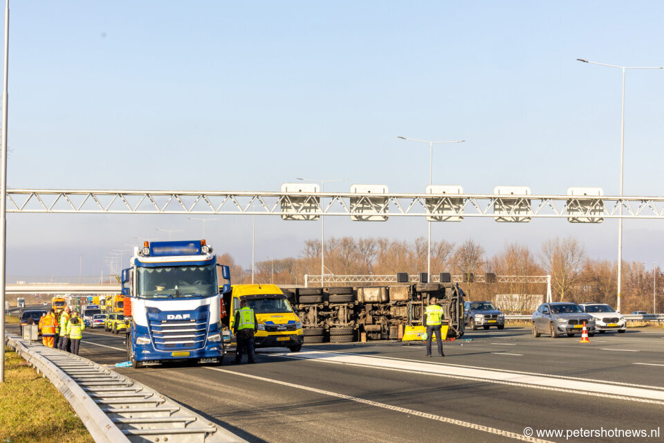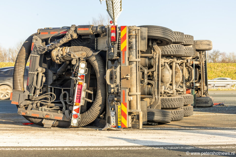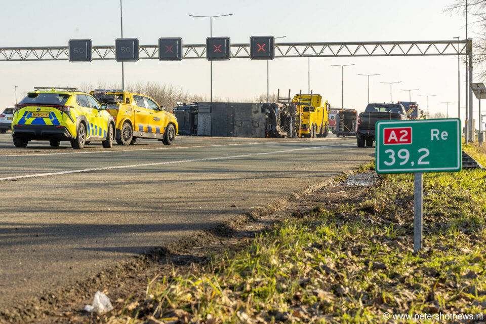 Vrachtwagen in 'sleep' gekanteld op A2 Abcoude