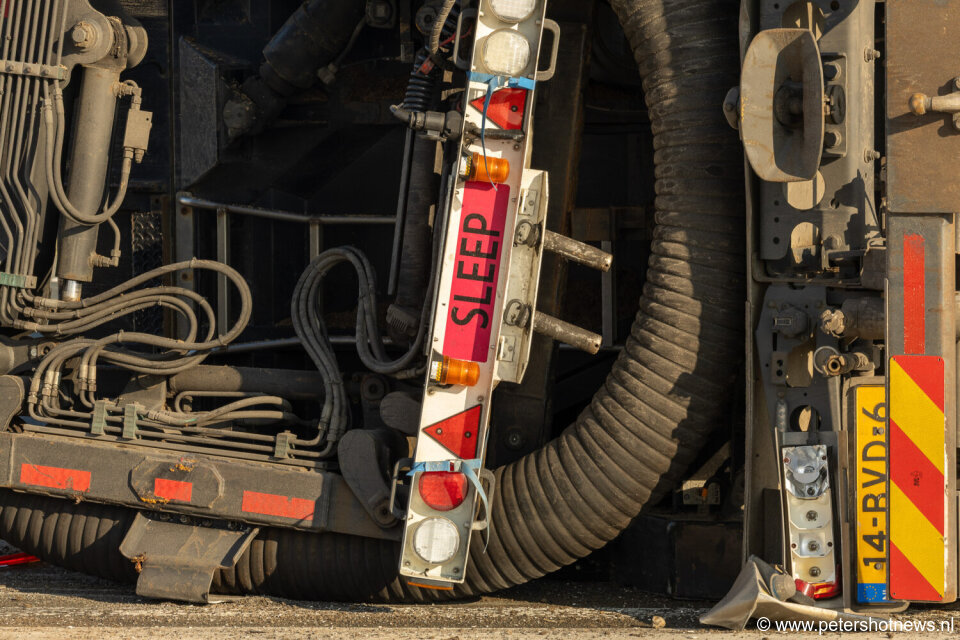 Tijdens het slepen van een zogeheten zuigwagen ging het om 13.30 uur mis en kantelde de vrachtwagen welke gesleept werd. Niemand raakte bij het ongeval gewond, maar de schade is groot. Een bergingsbedrijf is ingeschakeld om de veegwagen weer overeind te zetten.