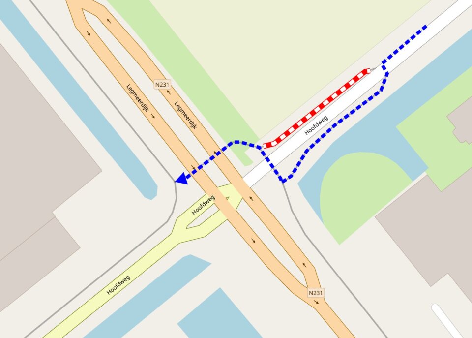 Tijdens de werkzaamheden zijn op de Legmeerdijk (N231) ter hoogte van de kruising minder rijstroken beschikbaar. Op de kruising begeleiden verkeersregelaars het verkeer. Alle richtingen van de kruising blijven beschikbaar.