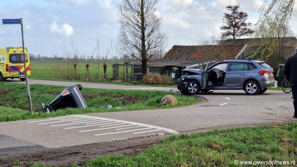Het ongeluk gebeurde rond 16.45 uur op de kruising van de Hoofdweg met de Westerlandweg. Door nog onbekende oorzaak kwamen twee auto’s met elkaar in botsing. Eén van de voertuigen belandde daarbij in het water naast de weg.