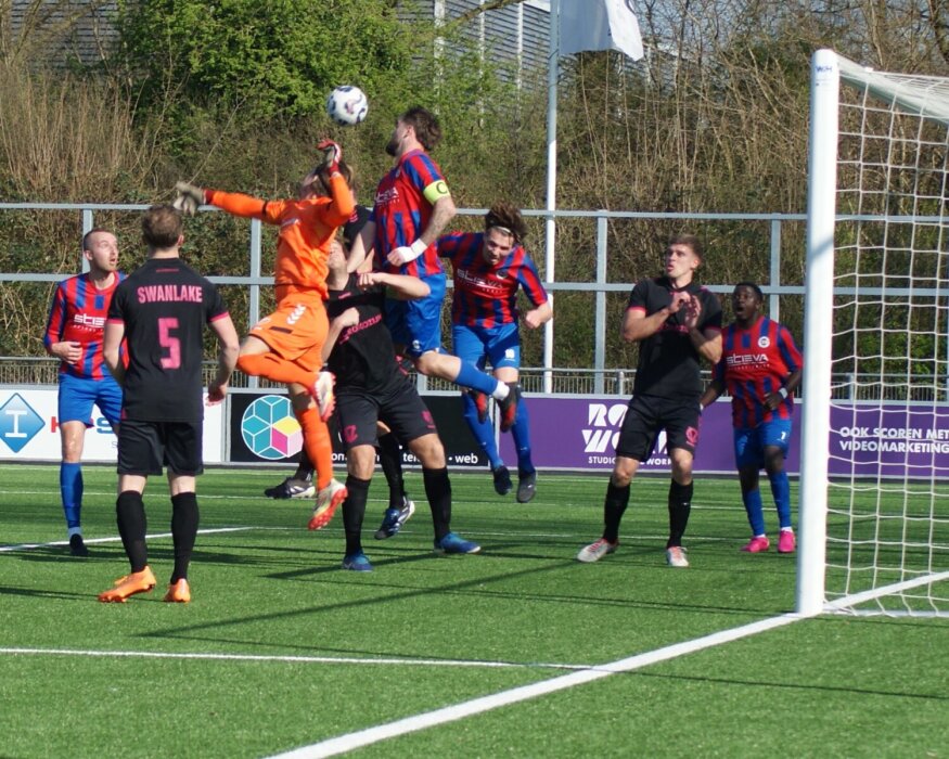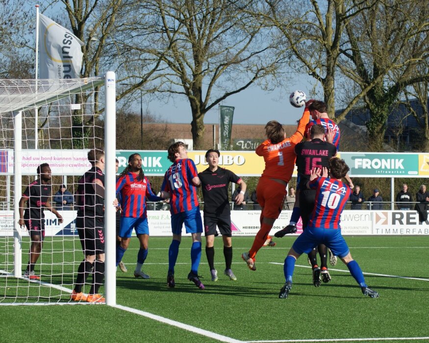 Direct na het eerste fluitsignaal trokken de gasten uit IJmuiden fel van leer. Men zocht de aanval zonder daarbij tot kansen te komen. Na 10 minuten vond CSW het ritme en werd de regie overgenomen. Tot aan de 31e minuut kwam de thuisploeg tot een handvol kansen. Een inzet van dichtbij van Berry Kramer werd gered, een hard schot van Dylan Bergkamp ging net over. Na een voorzet van diezelfde speler kwam Kramer bij de tweede paal een teenlengte tekort en een omhaal van Oliemans werd op de lijn met hoofd gered. Een keer was Stormvogels dicht bij een treffer. Keeper Giovanni Santangelo red in twee instanties. Tot aan de rust speelt CSW één van haar betere eerste helften, maar wat te vaak ontbreekt, is de eindpass. In de 43e minuut kopte Kramer een bal duidelijk over de lijn, maar de leidsman dacht hier anders over. En wanneer de goal niet valt aan de ene kant dan….. Het was een geweldig afstandsschot van Jan Koridon van zo’n 16 meter waardoor de bal op slag van rust onhoudbaar in de kruising verdween.