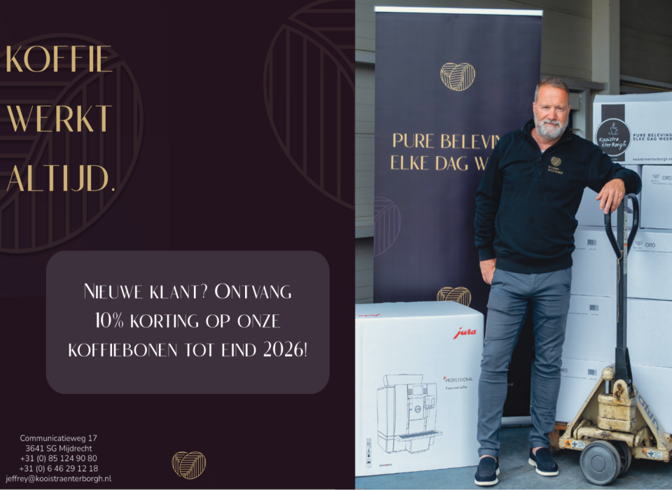 Om nieuwe bedrijven kennis te laten maken met hun werkwijze, biedt Kooistra & ter Borgh momenteel een actie: nieuwe klanten ontvangen 10% korting op koffiebonen tot eind 2026.