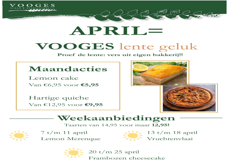 De lente is begonnen en dat proef je bij Bakkerij Vooges. In de hele maand april staan frisse en hartige smaken centraal met aantrekkelijke acties op ambachtelijk bereid gebak en hartige specialiteiten.