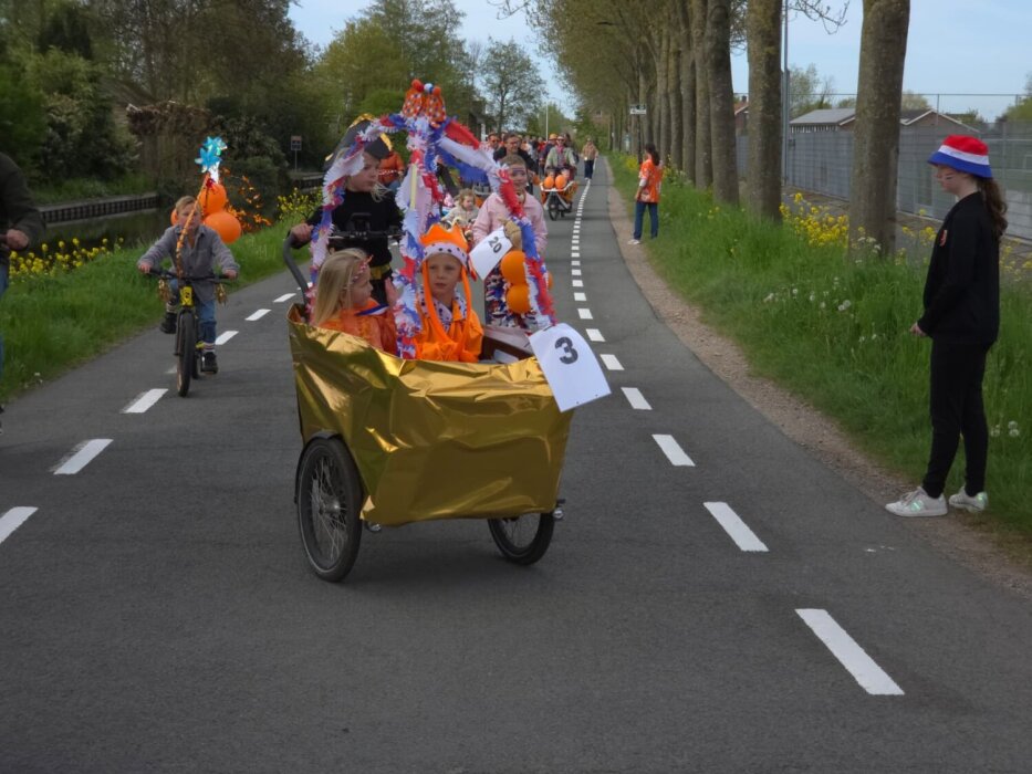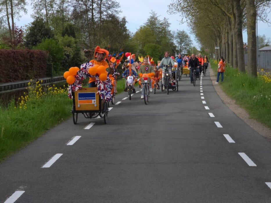 In de van Meerendonkstraat kwamen er steeds meer kinderen met een prachtig versierede fiets, skelter of step. Alle kinderen kregen een nummer en rond 09.45 uur vertrok de optocht achter de bakfiets aan de Hoef door op weg naar HSV. We werden toegejuicht, er werd onderweg geklapt en gezwaaid, ja de Hoef kon zien dat het Koningsdag was. Aangekomen bij Hsv fietste de kinderen nog een paar rondjes om die prachtige creaties te laten zien en was het tijd voor koffie/thee, limonade en een heerlijk Oranje cakeje.