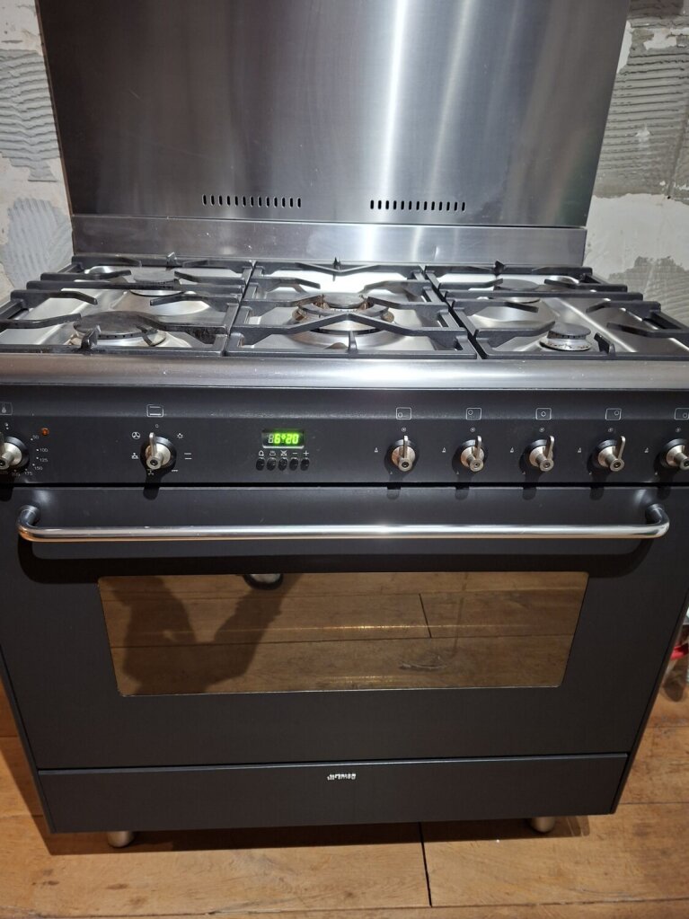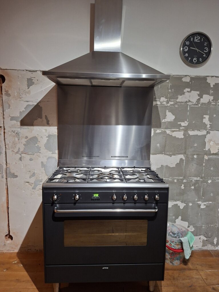 Fornuis breed 90 cm H 90 cm, RVS achet plaats breed 90 cm en 70 cm hoog, RVS afzuigkap 90 cm breed en 25 cm hoog RVS afdekkap afzuig kanaal 60/80 cm hoog.