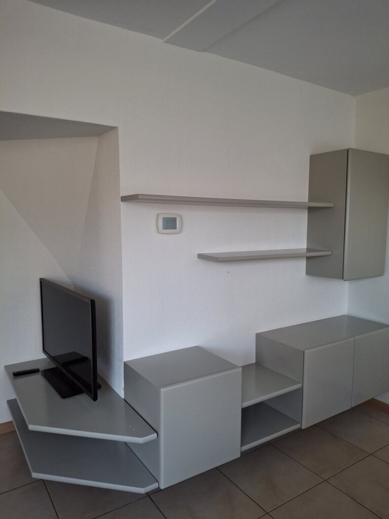 Banz Bord wandmeubel, in mooie grijze kleur. Montage met beugels in de muur. Afgeronde kanten en hoeken. Dit is door de tv planken een hoekopstelling. Deze planken kunnen achterwege blijven.