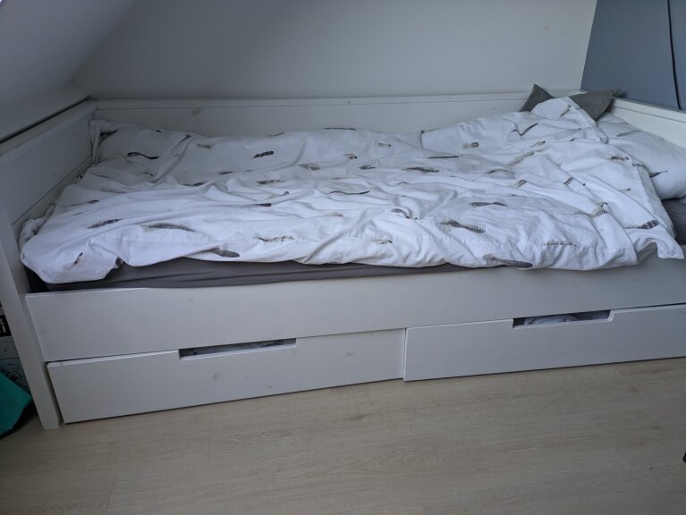 Wit (whitewash) 1 persoonsbed (90x200) met goede lattenbodem en matras. Het bed heeft een hoge rand (75 cm) waardoor je er met kussentjes ook lekker op kunt zitten. De maat incl rand is 210X100. Onder het bed zitten 2 grote lades.