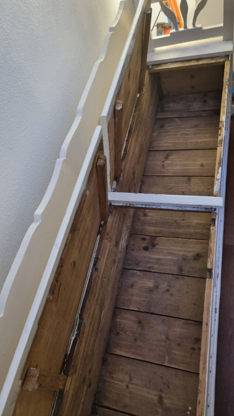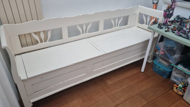 Prachtige vintage bank met opbergruimte, afkomstig uit vintage meubelwinkel. Mooie details in de leuningen, stevige contstructie, veel opbergruimte. Een echte eyecatcher!