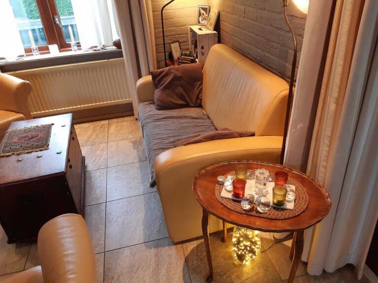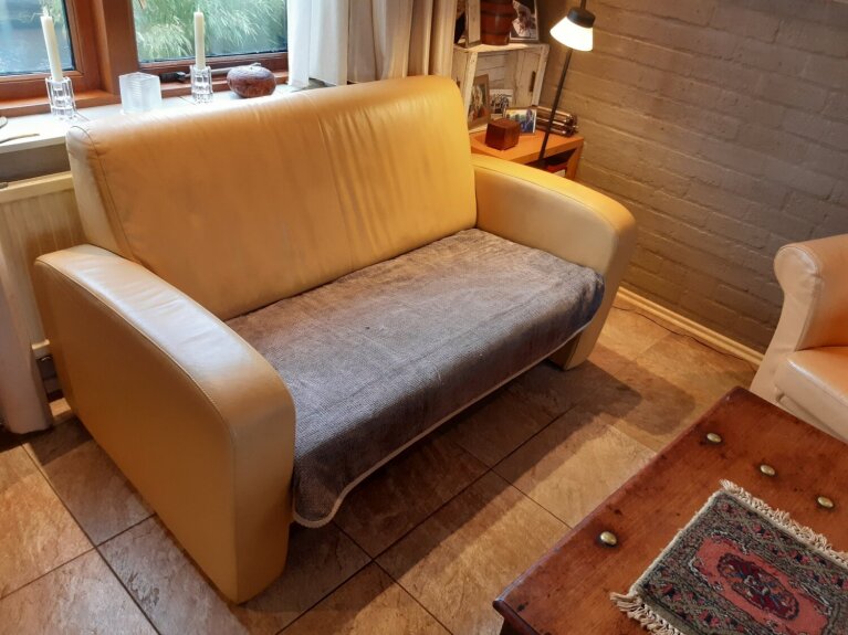 beige leren 2-zitsbank, goede staat alleen krassen op de zitting (lap of deken eroverheen - dan kan die nog jaren mee)