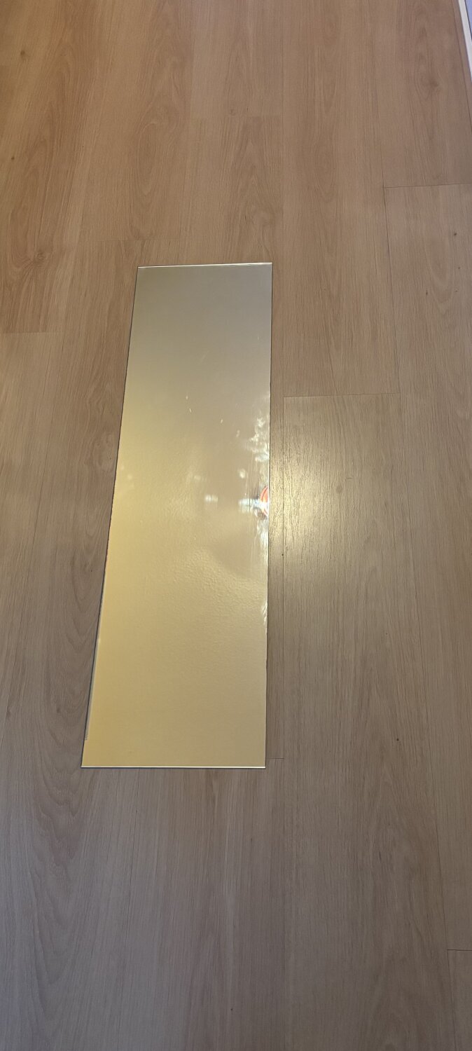 Grote spiegel is 90 cm lang zonder omlijsting met bevestigingsbeugels. Mist alleen de 4 schroeven om het op te hangen.