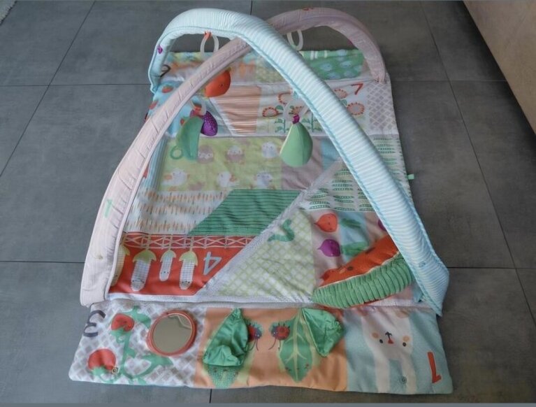 Leuk en kleurrijk baby speelkleed met boog. In goede staat, klaar voor een nieuwe baby om te ontdekken en te spelen. Met verschillende texturen en activiteiten om de zintuigen te stimuleren.