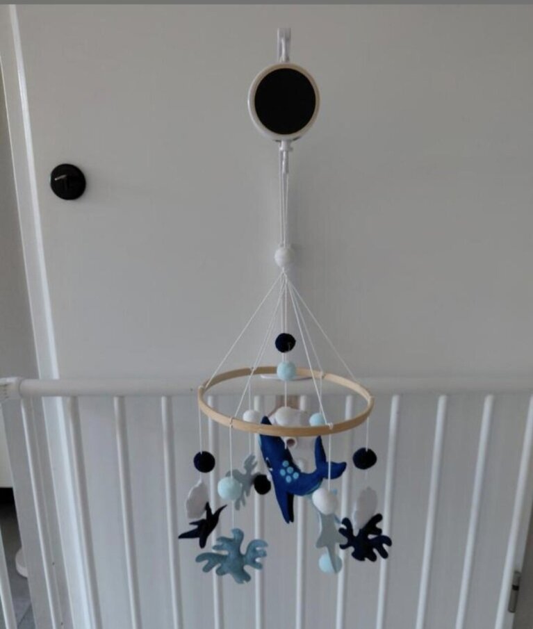 Handgemaakte muziek mobiel met een schattig oceaan thema, perfect voor de babykamer. Zorgt voor een rustgevende sfeer en stimuleert de visuele ontwikkeling van je baby. In uitstekende staat.