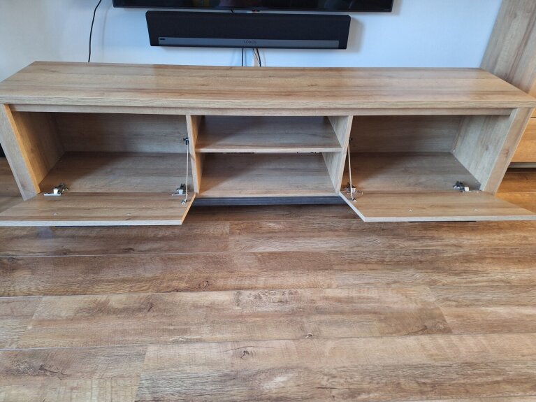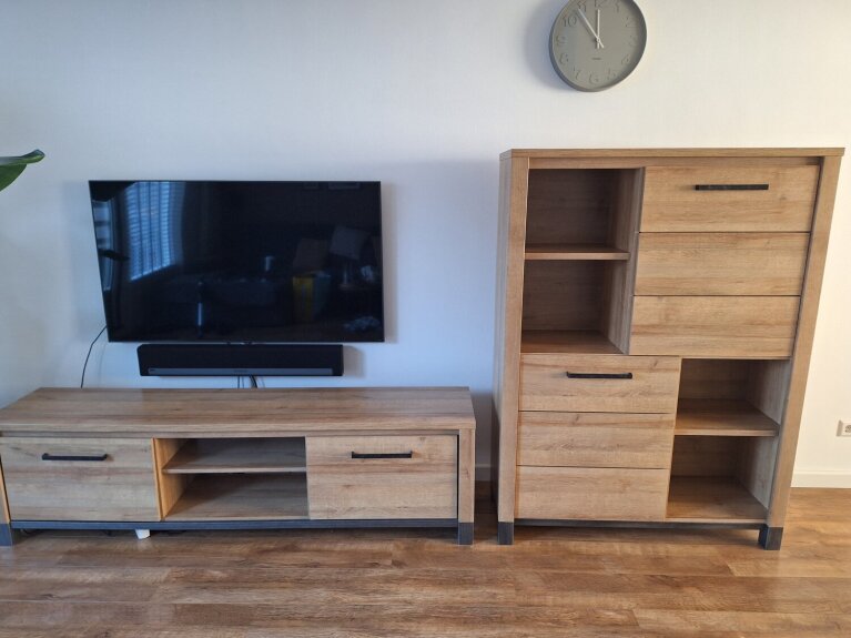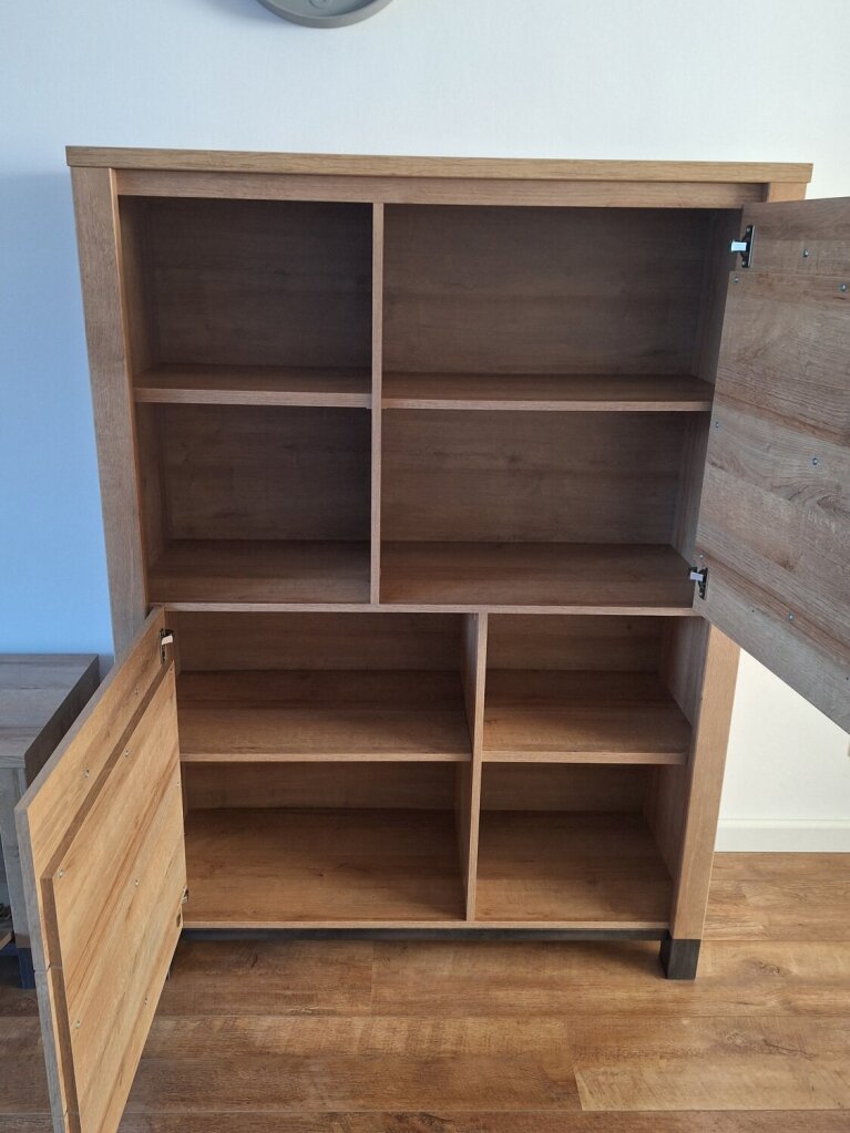 Te koop zeer nette set bestaande uit een dressoir en kast in een lichteiken kleur met donkergrijs onderstel.