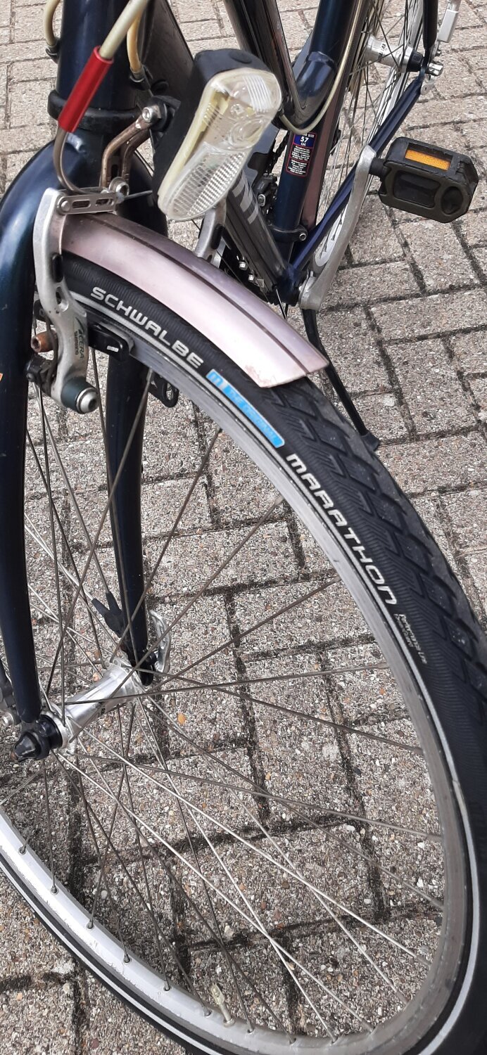 Vrijwel nieuwe Schwalbe Marathon banden. Goede remmen (v-brakes) en versnellingen (24). Werkende verlichting (batterij). Comfortabel gel zadel. Altijd binnen gestaan. Vraagprijs €125.