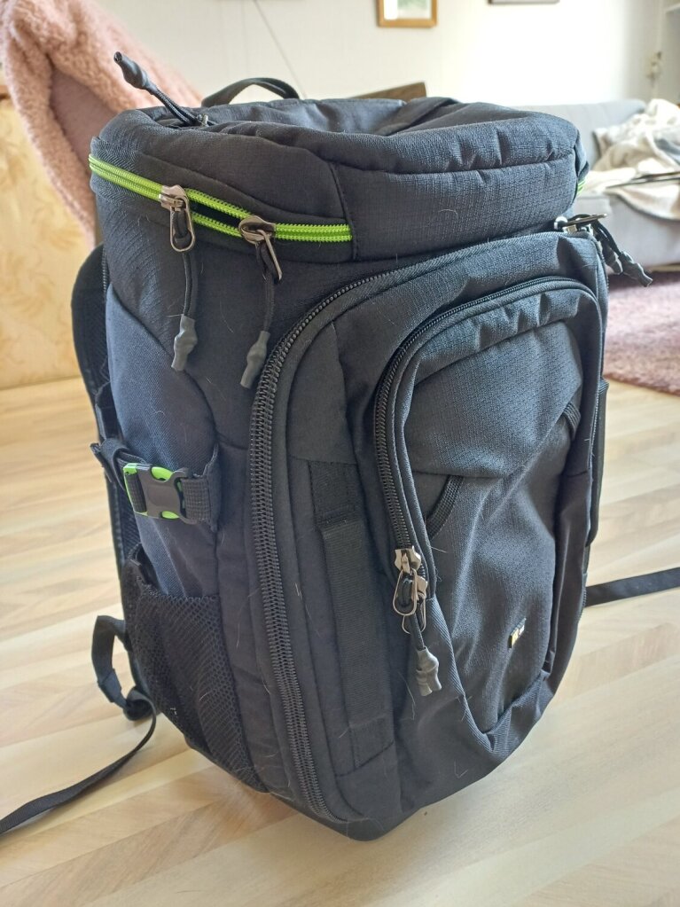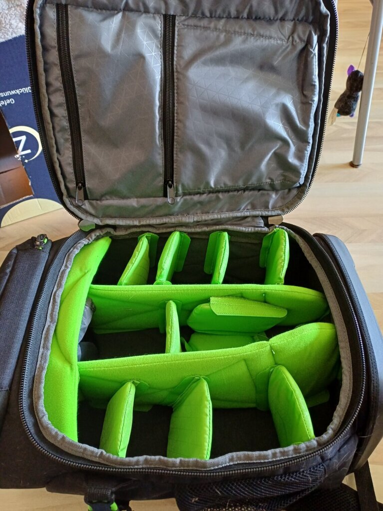 Case Logic fotocamera rugtas met verstelbare vakken voor cameralenzen, diverse opbergvakken, laptop vak, apart opberg gedeelte camera, aan beide zijden vakken en bevestiging voor statief, 46 cm hoog, 30 cm breed, 22cm diep, 60 euro