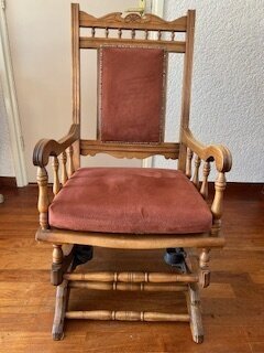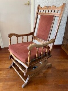 Deze unieke schommelstoel is gemaakt van hout en heeft een roodbruin kussen. De schommelstoel staat op een vast frame waardoor de vloer niet beschadigd door het schommelen. De stoel is in goede staat en heeft een klassieke uitstraling. Het rugleuning kussen is vastgemaakt aan de stoel. Het zitkussen is los.