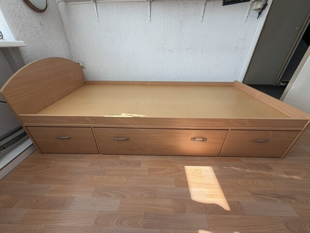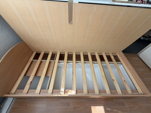 Compleet eenpersoons bed in licht beukenkleur, inclusief lattenbodem, hardboard ligplaat, drie ruime rollades.